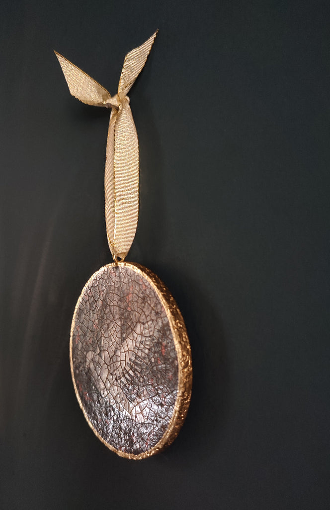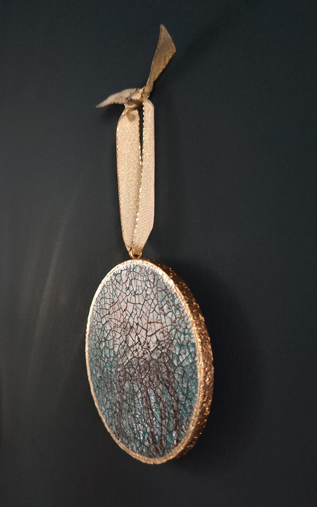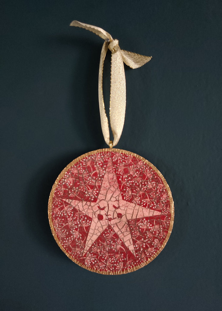 Inspired by old-fashioned Christmas baubles, these flat, decoupaged decorations are made entirely by hand. They feature Emily's illustrations on their fronts, an antiqued gold effect on their backs and sides, and each one comes with a gold-trimmed ribbon attached for hanging on a Christmas tree. Made from cork, they are light-weight and environmentally friendly. Their hand-painted gold edging frames each illustration and catches the light beautifully, and the crackle glazed finish adds to their vintage feel.