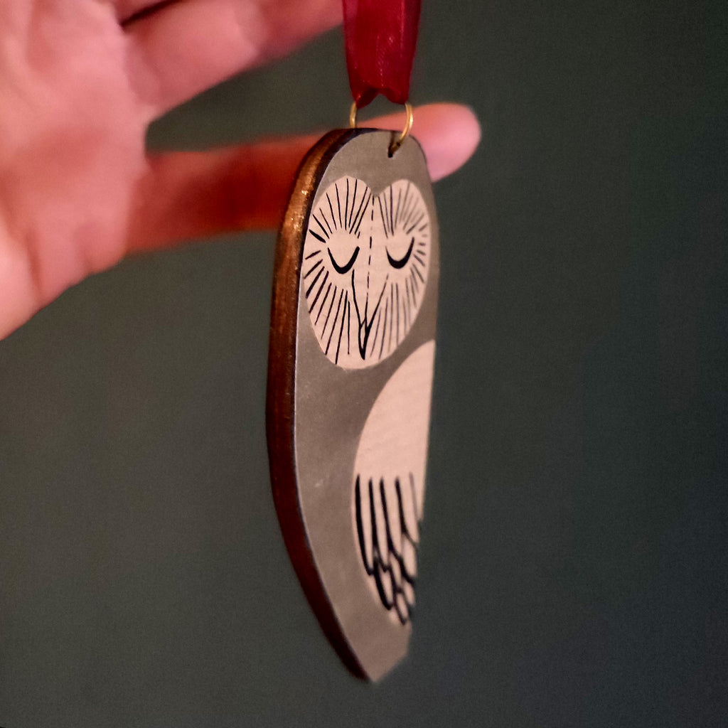 These gold & brown owl Christmas decorations are made using laser-cut plywood, liquid gold leaf, and my illustrations on brown paper. Finished with ribbon made from maroon coloured organdie fabric. They are double-sided and catch the light beautifully, making them perfect additions to any Christmas tree.